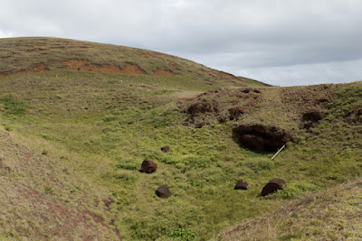 La misma piedra fue utilizada también en algunos ahus y en uno de los moai de Vinapu. Contrariamente a lo que dice la Wikipedia en español en el momento de escribir esto, el famoso moai arrodillado (moai Tukuturi) fue esculpido en otro tipo de roca, toba del volcán Rano Raraku.